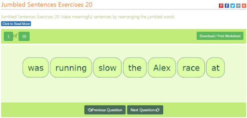 Look at a few of those example practice online exercises at k8schoollessons.com. Click the above link and enjoy rearranging jumbled sentences and making them meaningful sentences.